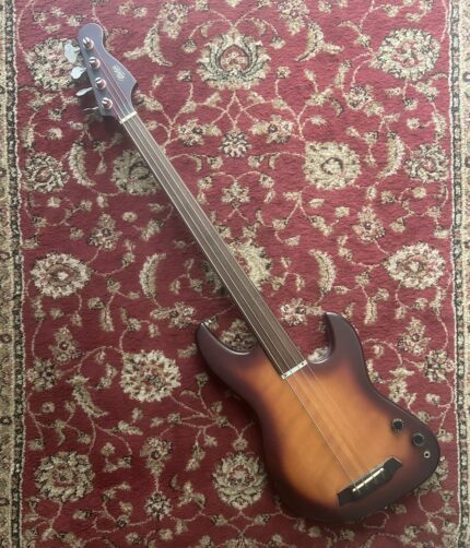 A very rare bass , completely hand made in New Zealand by the genius of Tomm Stanley . They are made using a very unique design and locally sourced timber. Comes with the original branded gig bag Here is a full description from the Stonefield website Topwood: Cypress Fingerboard: Solomon Island Ebony Fingerboard Markers: Burghundy within White Gem Dots Fingerboard Radius: Zero Hardware: Titanium/blue Binding: – fine line: Australian Blackwood Sap – thick edge: Jarrah Nut: Jarrah Back of Neck Finish: Natural An M Series with a twist; This one was built to a unique set of specifications and is one of only two basses we’ve ever built with a zero-radius fingerboard and a centre veneer on the front covering the laminates of the through-body core. It has also been sprayed in a matte satin clear and has a Funk Plate and Ramp, both veneered in tiger myrtle to match the jarrah binding and bridge. String Spacing: Classic (approx 19mm between strings at the bridge) Due to the low serial number, a unique build and the addition of customer requested mods, this bass has true potential for collectibility. A few notes: This is only the second bass we’ve made with a zero radius fingerboard. Note the cypress veneer over the laminates in the centre of the body. This is only the second instrument on which we’ve veneered over the laminates. In addition to the Funk Plate a ramp has been added between the rear pickup and bridge. This is the first bass on which we’ve ever installed a ramp. Both the Funk Plate and the ramp have been surfaced with Tasmainian tiger myrtle. For greater durability the top has been sprayed in a satin matte lacquer over the original hand rubbed oil.