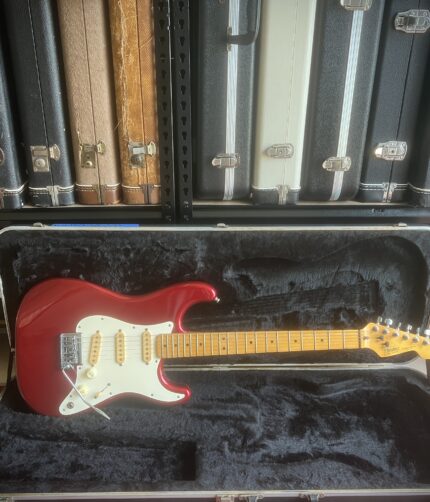 1983 Dan Smith Era Strat in rare candy apple red finish and in mint condition. All Original beside a replaced nut. This 1983 Dan Smith Era Stratocaster stands as a testament to the innovative period under Dan Smith’s leadership at Fender. Dan Smith served as the president of Fender Musical Instruments Corporation from 1981 to 1985, overseeing a pivotal era of change and revitalization for the iconic guitar brand. It has a master volume and master tone, with the output on the front side in place of where the tone pot usually is, which was one of the few innovations on these rare Dan smith strats. These guitars are known for their distinct features, including a smaller, more compact headstock, a six-point synchronized tremolo bridge, and a unique 4-bolt neck plate design. The black finish adds a touch of elegance to the instrument. Dan Smith’s contributions at Fender during this period revitalized the company’s reputation for producing high-quality guitars, and his influence is still felt in the legacy of instruments like the 1983 Dan Smith Era Stratocaster. Comes with original case