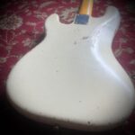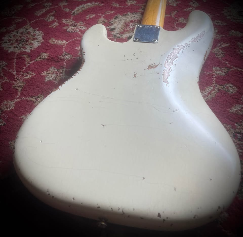 All original beside an old professional nitro refinish in olympic white, a new nut and a refret.