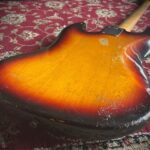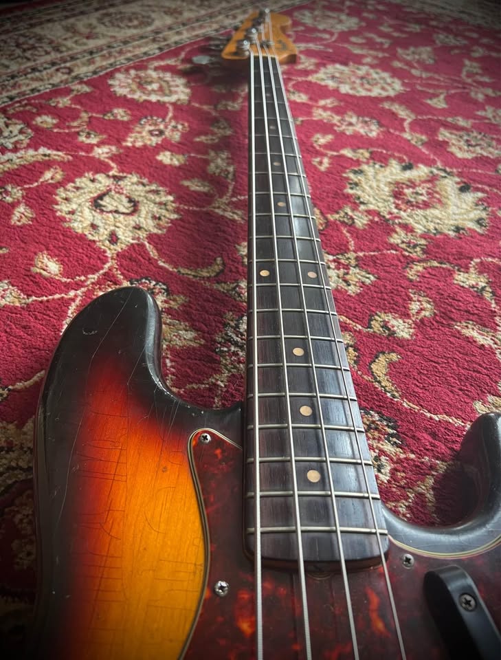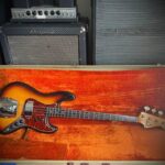 From the 4th year of production, this 61 years old Fender Jazz Bass is just perfection. Great weight, amazing tone, super comfortable neck profile, coveted Brazilian rosewood fretboard and a stunning 3 tone sunburst finish, all topped by the original rare cream tolex hard case, which was only made for less than a year. The alder body is resonant and light, finished in a beautiful 3 colour sunburst where the red hasn’t faded and still nice and vibrant. The pickguard doesn’t have cracks or the common snapped horns and doesn’t show signs of shrinking. The original 1963 pots work without scratches and the black bobbin pickups sounds delightful. Straight neck with a fully functional trussrod and a nice and smooth profile , so comfortable to play. Pickups covers in great condition as the rest of the original hardware. One for players and collectors.