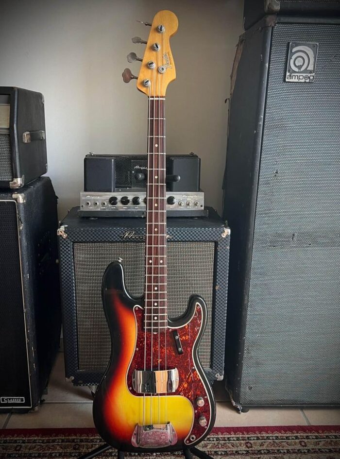 With a beautifully aged original 3 colour sunburst finish, this 50 years old Fender Precision Bass is a great player, thanks to the light weight and the huge sustain.
