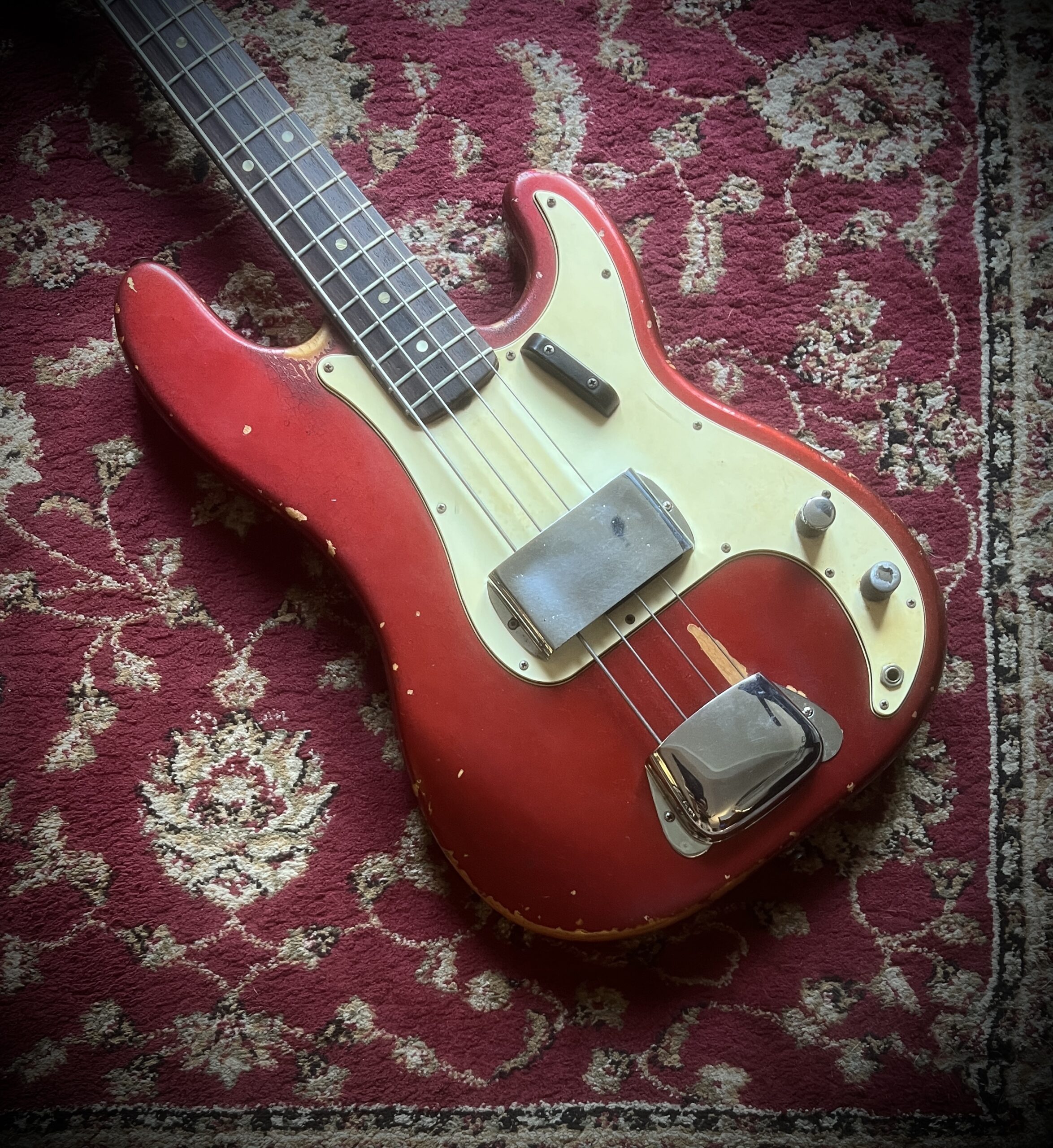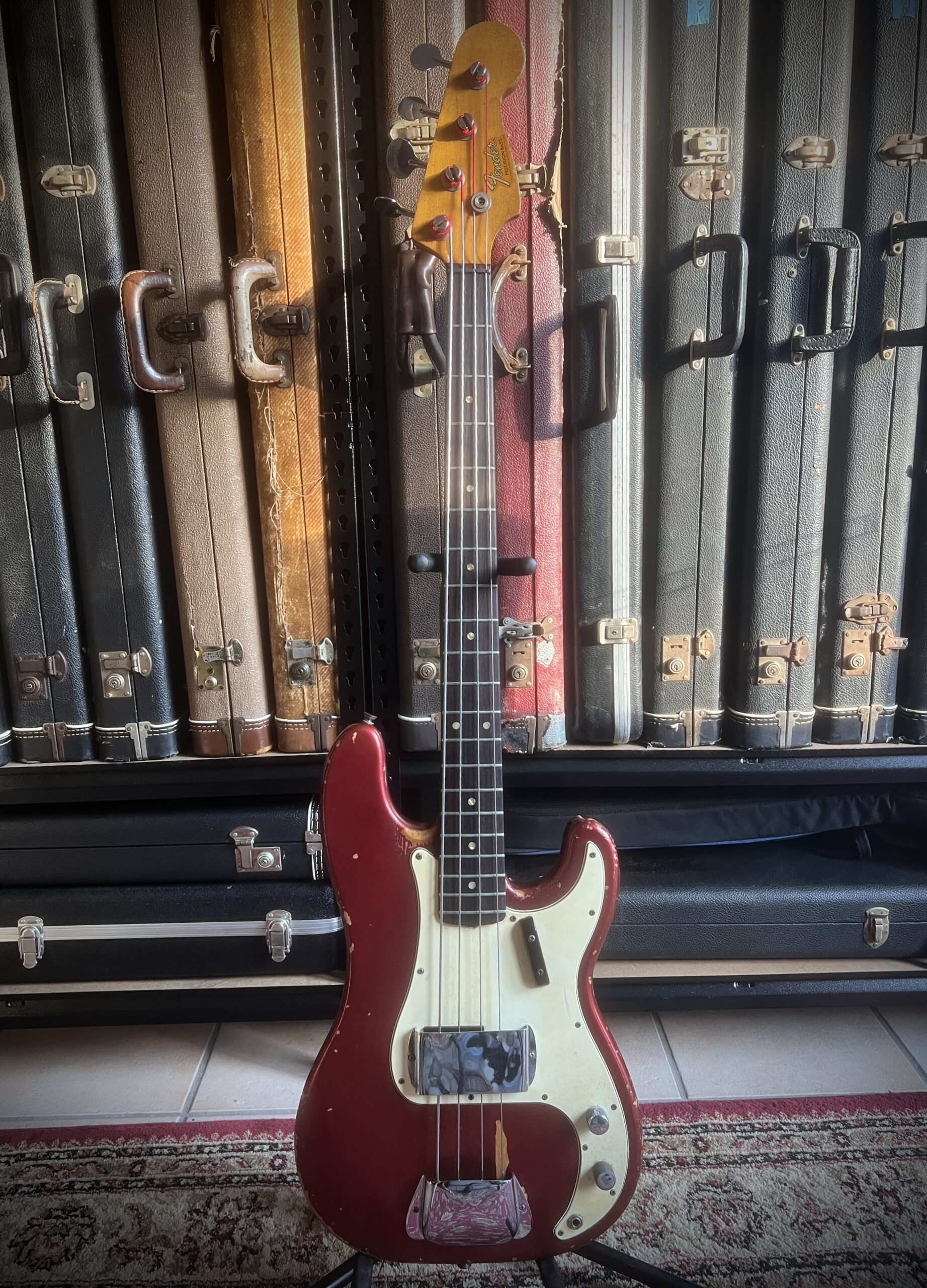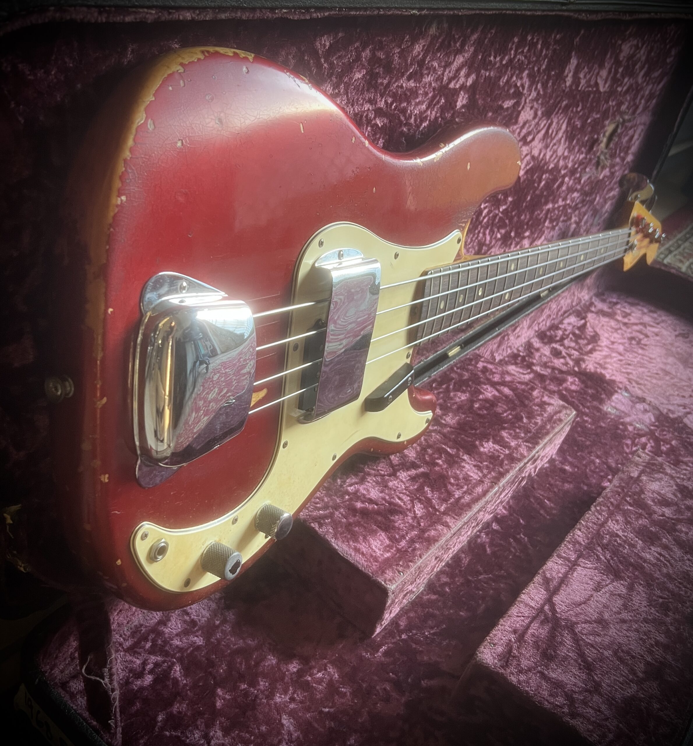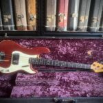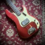 Absolutely stunning and very rare custom candy Apple Red finish for this 58 years old Fender Precision bass. Light and resonant , with a sublime neck profile and the perfect Pbass tone, this bass is just a work of art. Nitro finish, Brazilian Rosewood fretboard and black bobbins pickups ( all features from the early preCBS days, but 68 was a transition year at Fender and they used all the leftovers, making some of the best instruments ever made). Let’s not forget those gracious and rare Oval tuners aka Lollipop or Paddle, which were only available on the early 1968 Pbasses. Beside a new nut and a replaced screw on one of tuners, this instrument is completely original, with untouched solder joints, both covers still on and comes inside the original Stamford case. One for players and collectors, super rare and a superb player. Partial trade always welcome