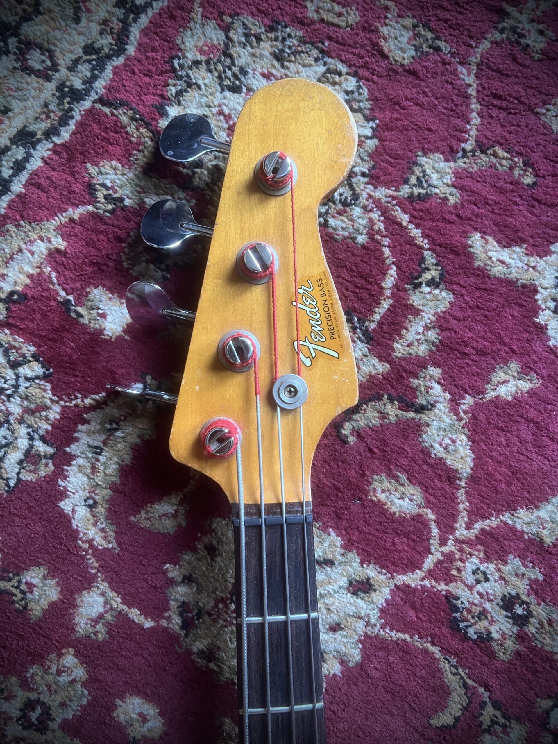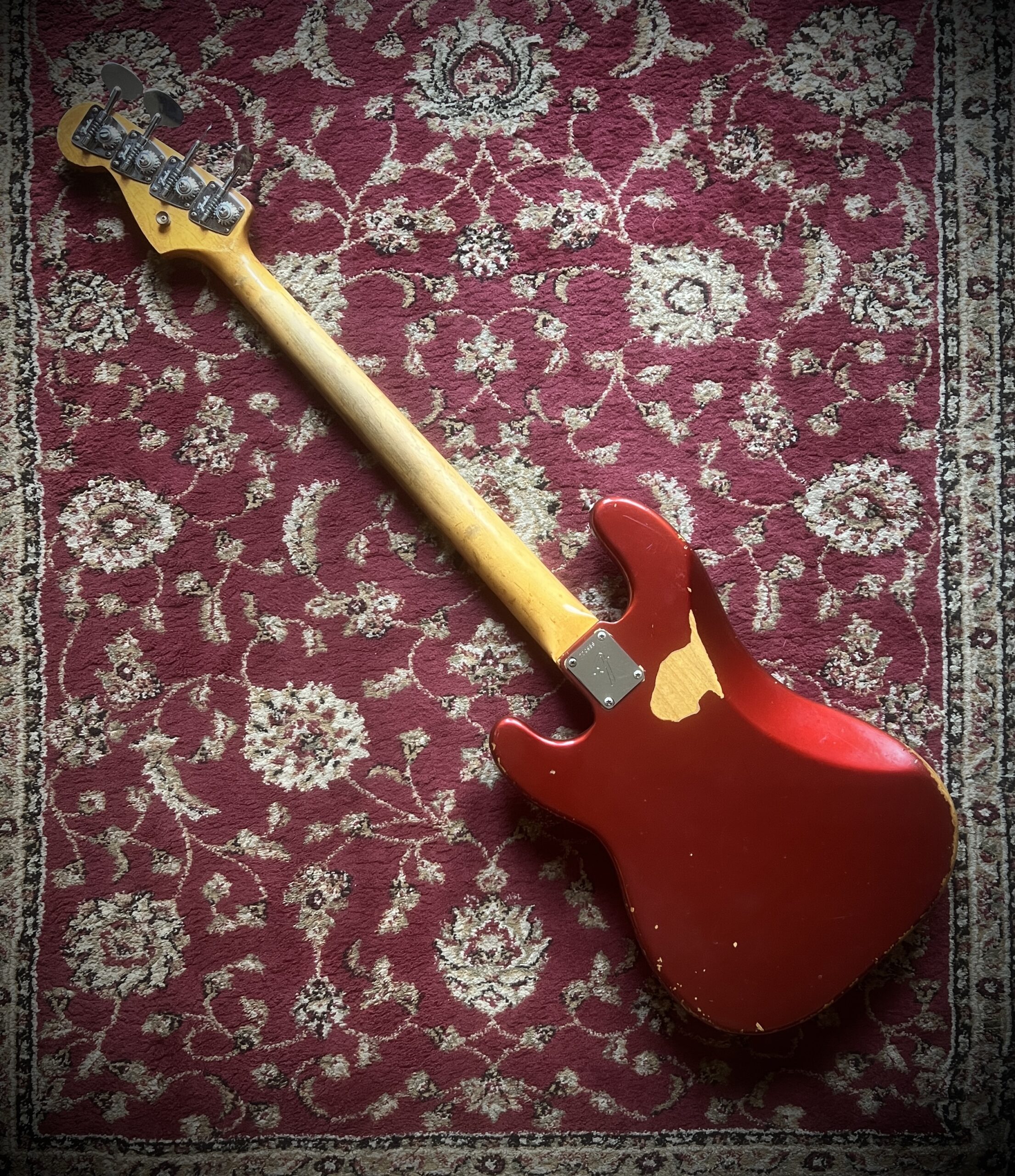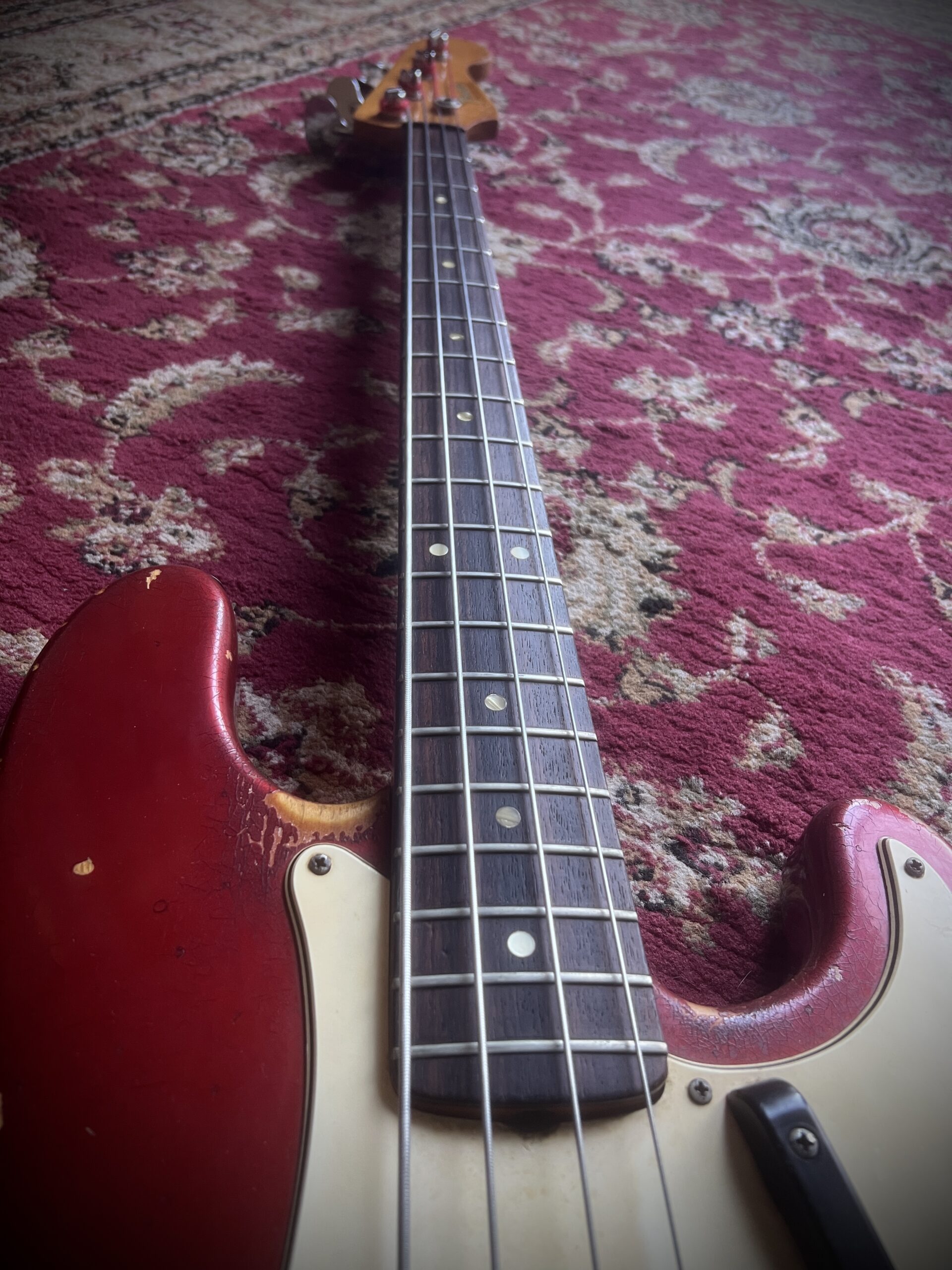 Absolutely stunning and very rare custom candy Apple Red finish for this 58 years old Fender Precision bass. Light and resonant , with a sublime neck profile and the perfect Pbass tone, this bass is just a work of art. Nitro finish, Brazilian Rosewood fretboard and black bobbins pickups ( all features from the early preCBS days, but 68 was a transition year at Fender and they used all the leftovers, making some of the best instruments ever made). Let’s not forget those gracious and rare Oval tuners aka Lollipop or Paddle, which were only available on the early 1968 Pbasses. Beside a new nut and a replaced screw on one of tuners, this instrument is completely original, with untouched solder joints, both covers still on and comes inside the original Stamford case. One for players and collectors, super rare and a superb player. Partial trade always welcome