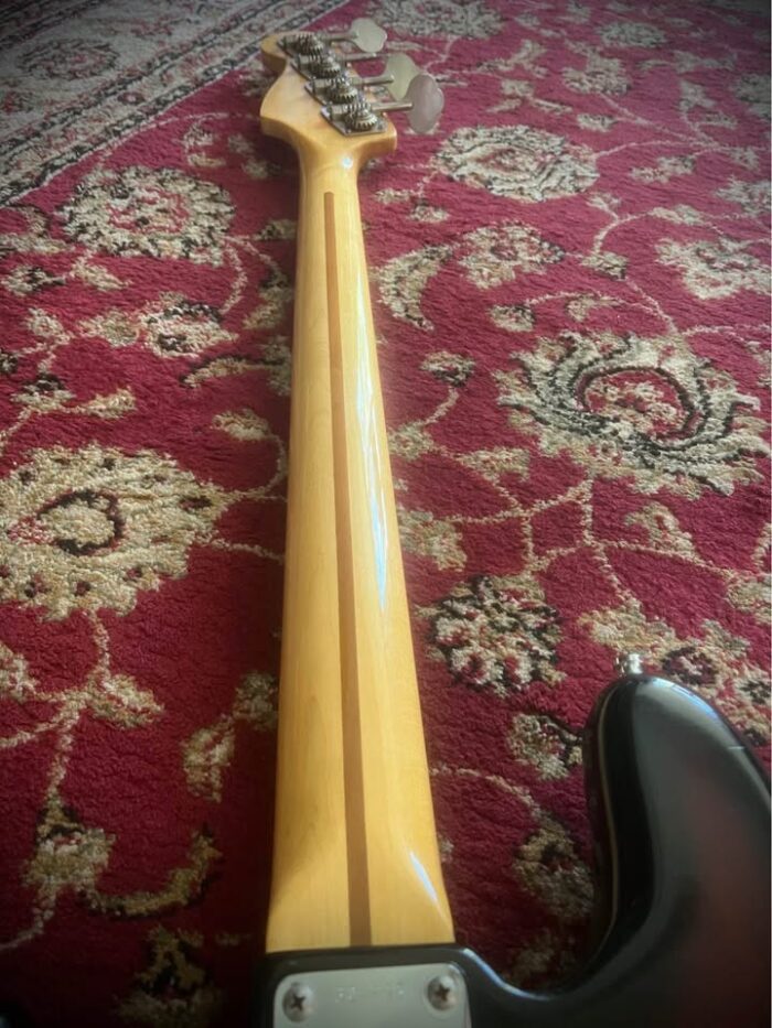 This version of the jazz bass only lasted 3 years and is known as “longhorn” or “boner” due to the longer upper horn to balance the weight as the short one has been cut deeper to access all the frets on the neck.