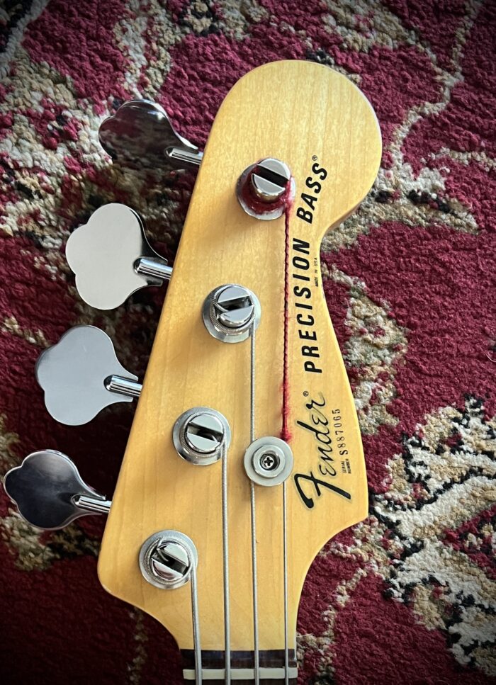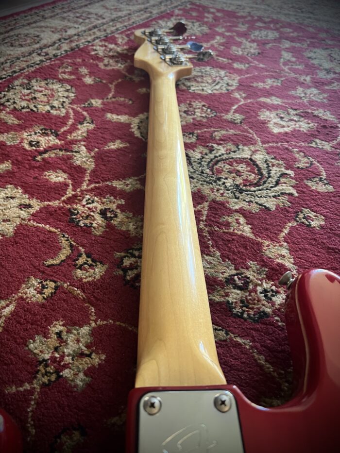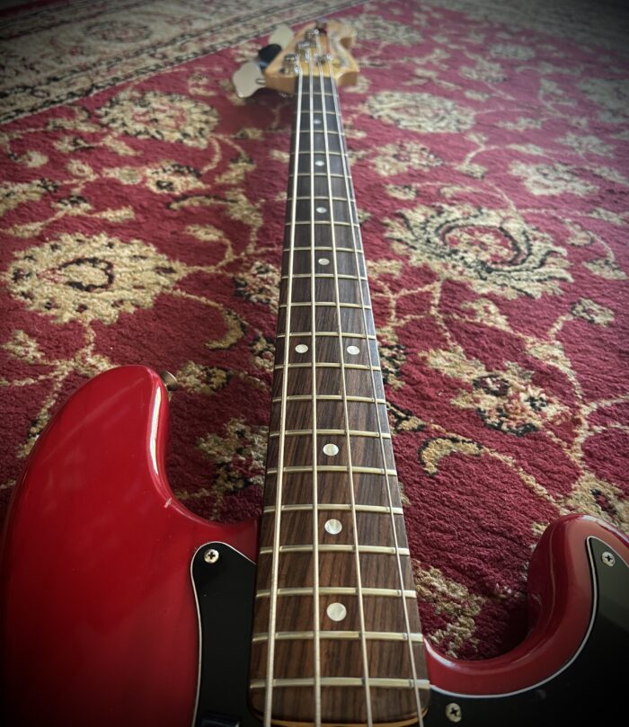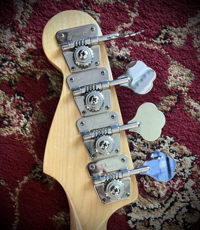 This version of the jazz bass only lasted 3 years and is known as “longhorn” or “boner” due to the longer upper horn to balance the weight as the short one has been cut deeper to access all the frets on the neck.
