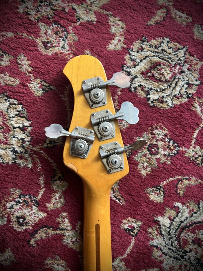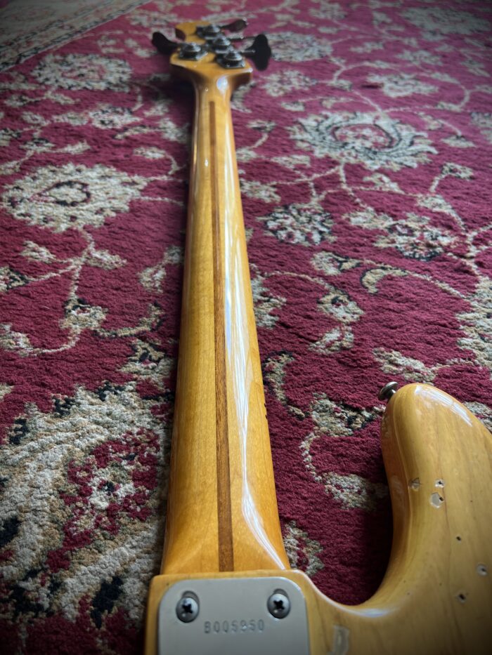 This version of the jazz bass only lasted 3 years and is known as “longhorn” or “boner” due to the longer upper horn to balance the weight as the short one has been cut deeper to access all the frets on the neck.