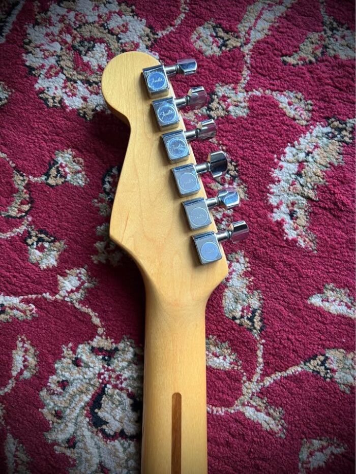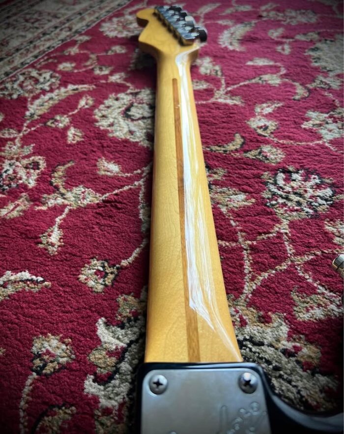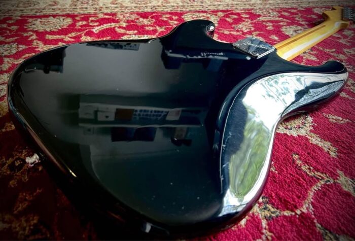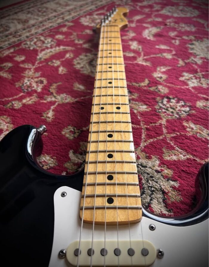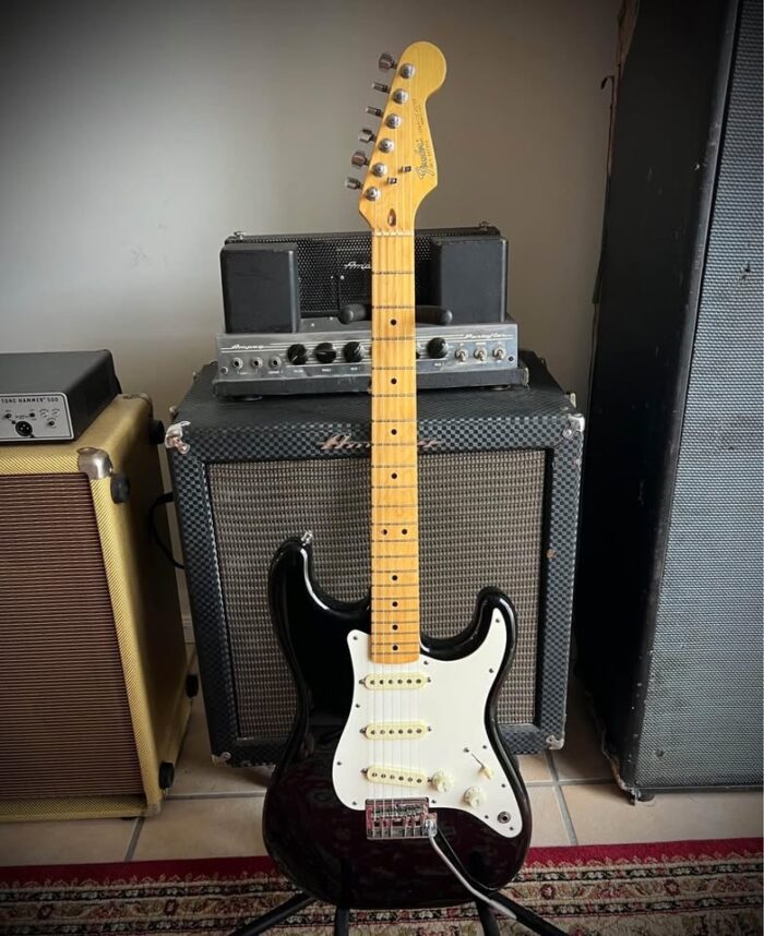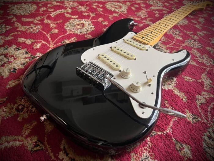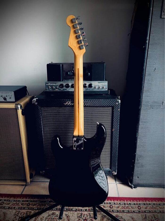This black 1983 Dan Smith Era Strat is super clean, not much wear and tear, practically mint condition. Smooth players guitar, no fretbuzz. It has a master volume and master tone, with the output on the front side in place of where the tone pot usually is, which was one of the few innovations on these rare Dan smith strats. The black 1983 Dan Smith Era Stratocaster stands as a testament to the innovative period under Dan Smith’s leadership at Fender. Dan Smith served as the president of Fender Musical Instruments Corporation from 1981 to 1985, overseeing a pivotal era of change and revitalization for the iconic guitar brand. The 1983 Stratocaster, produced during Smith’s tenure, reflects his commitment to quality and craftsmanship. These guitars are known for their distinct features, including a smaller, more compact headstock, a six-point synchronized tremolo bridge, and a unique 4-bolt neck plate design. The black finish adds a touch of elegance to the instrument. Dan Smith’s contributions at Fender during this period revitalized the company’s reputation for producing high-quality guitars, and his influence is still felt in the legacy of instruments like the 1983 Dan Smith Era Stratocaster. Comes with original case