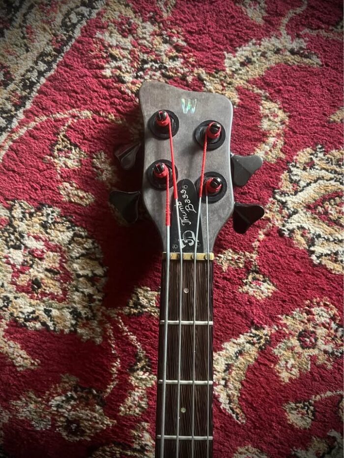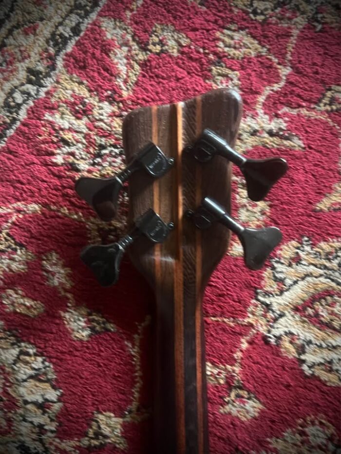 Very rare old school Warwick from 1986. One of Warwick’s enduring models is the Thumb Bass, introduced in 1985 as the JD Thumb Bass – the “JD” designation in reference to expatriate American bassist John Davis, who impressed Wilfer with his popping, funk-based style utilizing the stubbiest digit on his right hand. Bubinga body. 34″ neck trough neck with 26 frets. 7-piece neck of Wenge with Bubinga laminations. Fingerboard of Wenge with pearl dots inlays. Jumbo Warwick frets. The nut is *Just a Nut* brass version, each string adjustable in height. Original EMG pickups with 2-band active preamp. Shaller tuners and straplocks. Plays easy and has this beloved primal Wawrick sound. Made in West Germany / Pretzfeld / Franconia 4.1kg