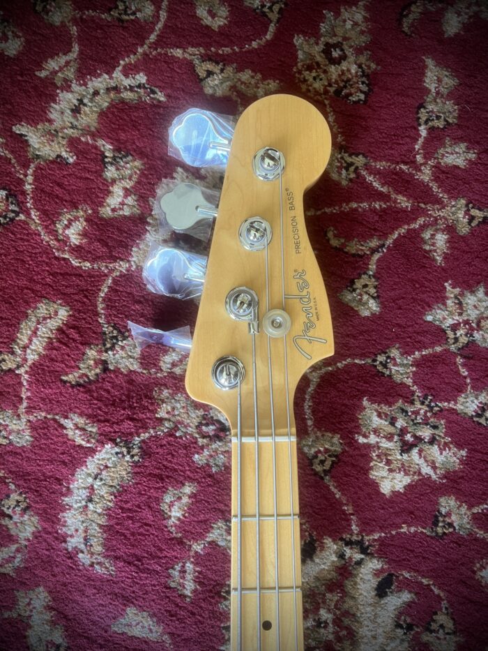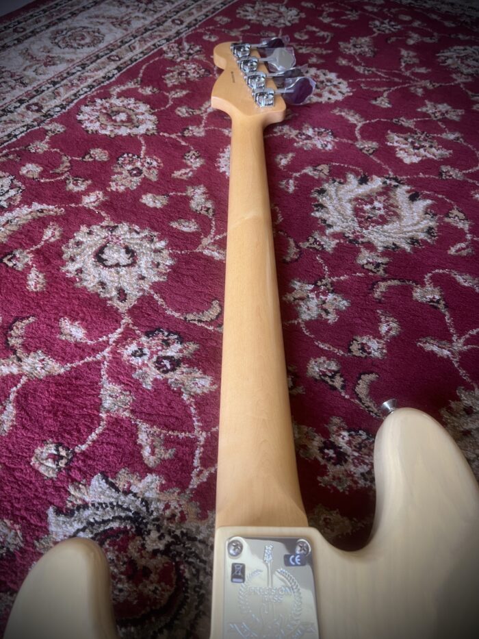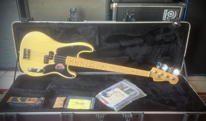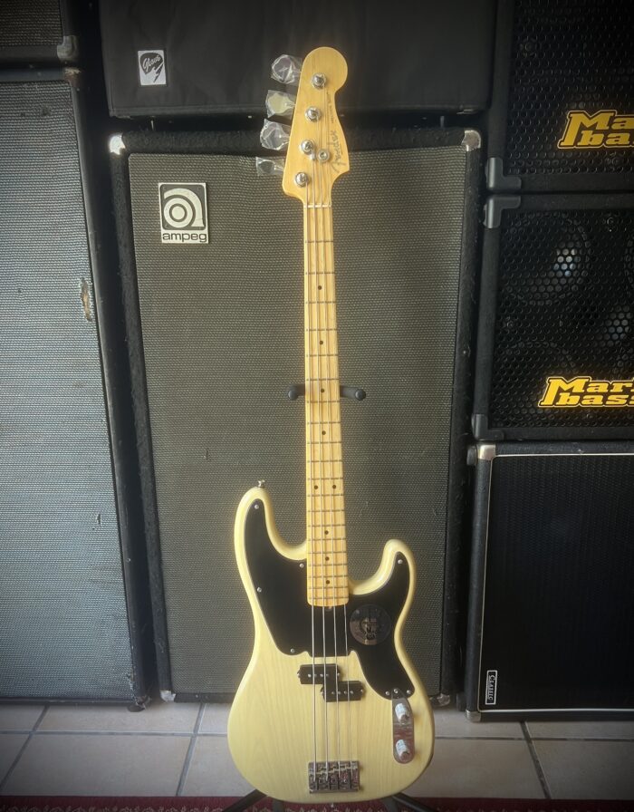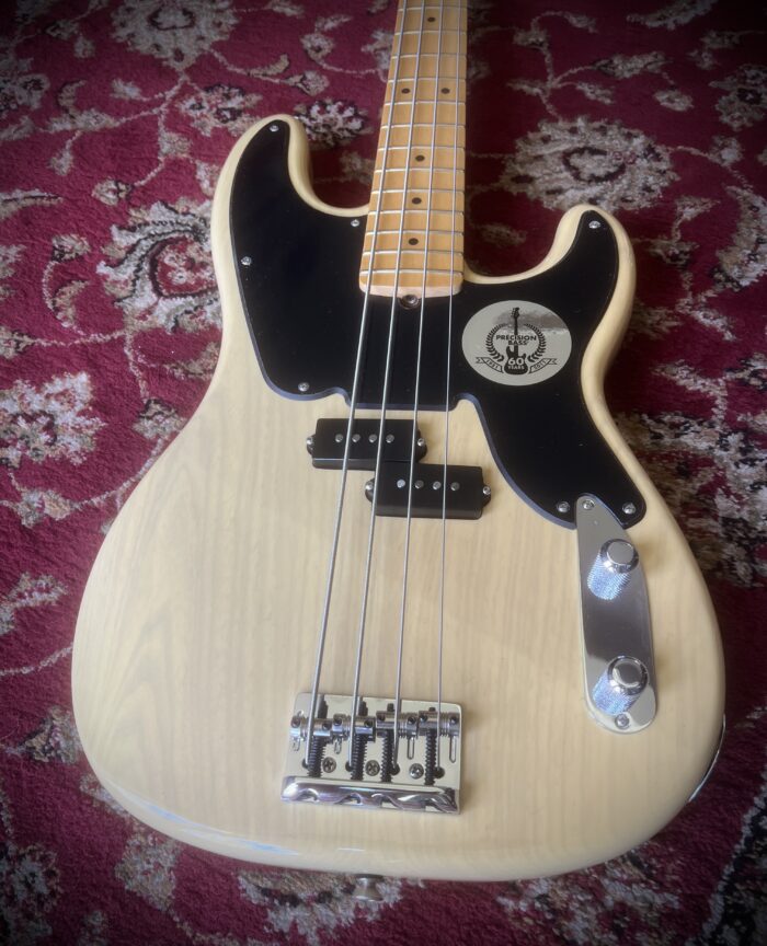 mint condition 2011 Fender 60th Anniversary Precision Bass, Blonde finish with the original SKB flight case and case candy. Extremely clean bass with only zero signs of use. The body wood is stained then the blonde is sprayed over the top, and it looks amazing. It’s been fully set up and has a straight neck with a great action. Nut width: 41.9 mm. Depth at 1st fret: 21.3 mm. Plastic still on tuners and pick guard . Features include an ash body, maple neck and fretboard with modern 9.5″ radius and medium jumbo frets, vintage Precision Bass split single-coil pickup, modern tuners, high-mass vintage bridge, knurled control knobs, black pickguard, Blackguard Blonde thin-skin lacquer finish, and Fender/SKB molded case. To further distinguish it as a special instrument created for the occasion, the 60th Anniversary Precision Bass bears a commemorative chrome neck plate honouring six decades of enduring Fender legacy.