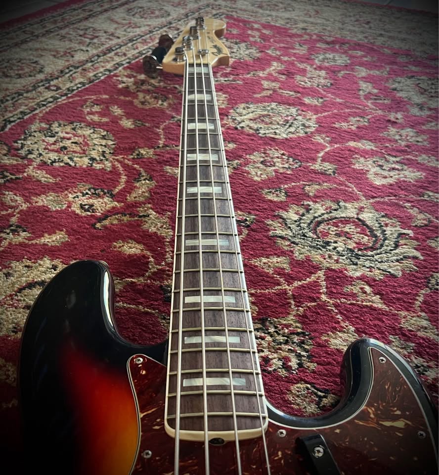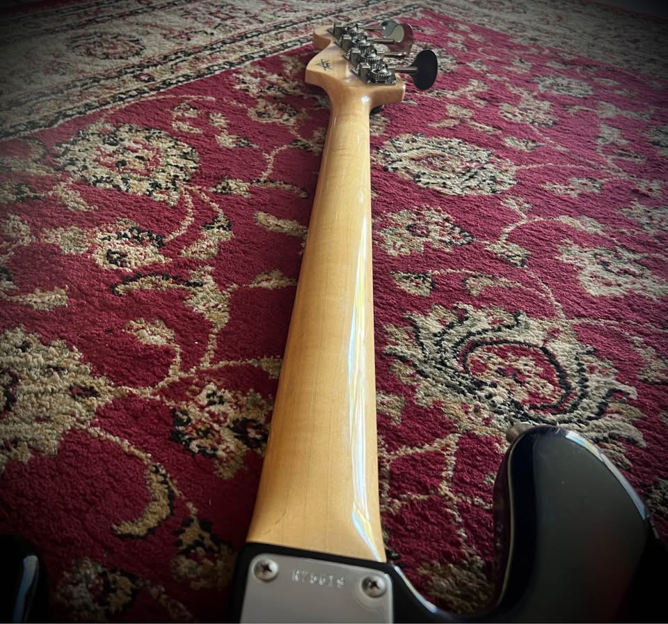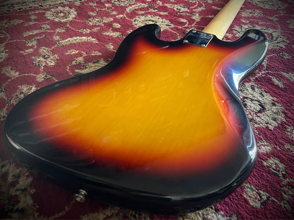 This version of the jazz bass only lasted 3 years and is known as “longhorn” or “boner” due to the longer upper horn to balance the weight as the short one has been cut deeper to access all the frets on the neck.