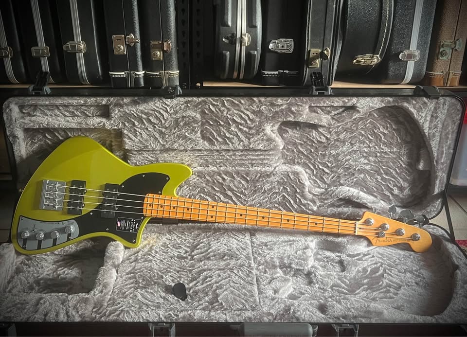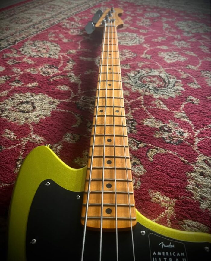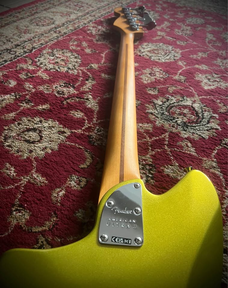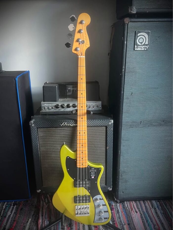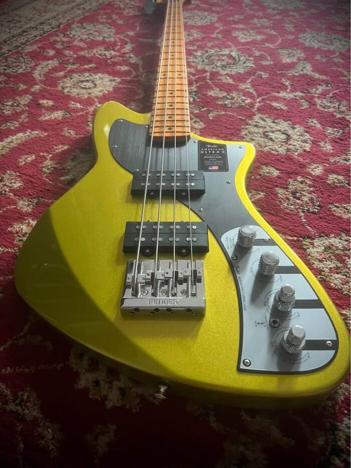 2 months old, brand new condition with case and all paperwork inside. Built for players boldly seeking the best, American Ultra II is our most advanced series of instruments. American Ultra II guitars and basses feature premium materials, precision craftsmanship and cutting-edge design for instruments that both advance the state-of-the-art and stand the test of time. The Fender® American Ultra II Meteora® Bass features a select alder body with sculpted body contours. For effortless playability, the quartersawn maple neck features our Modern D profile and smooth Ultra Satin finish. Quartersawn maple 10”-14” compound radius fingerboards feature Ultra rolled edges, medium-jumbo frets, Luminlay® side dots and Graph Tech® TUSQ® nuts. The tapered neck heel and sculpted body contours allow unparalleled access to the higher register, while the truss rod access at the headstock provides convenient and easy setup and adjustment. Outfitted with a set of specially designed Haymaker™ bass humbuckers, this bass delivers a massive tonal range with seismic lows, hard-hitting mids and sweet, articulate highs, all without a hint of hum. The redesigned preamp features unprecedented control to unlock endless tonal possibilities. Key features include S-1™ switching for active/passive operation, passive tone control and 3-band active EQ with switchable midrange frequency. Additional road-ready features including an adjustable HiMass™ top-load or string-through-body bridge, Fender light-weight tuners with tapered shafts, knurled aluminum knobs and 1-ply anodized aluminum pickguard. The American Ultra II Meteora Bass infuses iconic style with advanced appointments to take your playing to stratospheric new heights. For players who demand flawless tone, infinite versatility and limitless performance, American Ultra II delivers. Features Select Alder Body with Ultra Contours and Sculpted Neck Heel Graphite Reinforced Quartersawn Maple Modern “D” Profile Neck with Posiflex™ Support Rods 10″-14″ Compound Radius Quartersawn Maple Fingerboard with Ultra Rolled Edges and Luminlay Side Dots Haymaker™ Bass Humbuckers Ultra II Active Bass Preamp With S-1™ Switching 4-Saddle Adjustable HiMass™ Bridge (String-Through-Body or Top-Load) and Deluxe Fluted-Shaft Tuners
