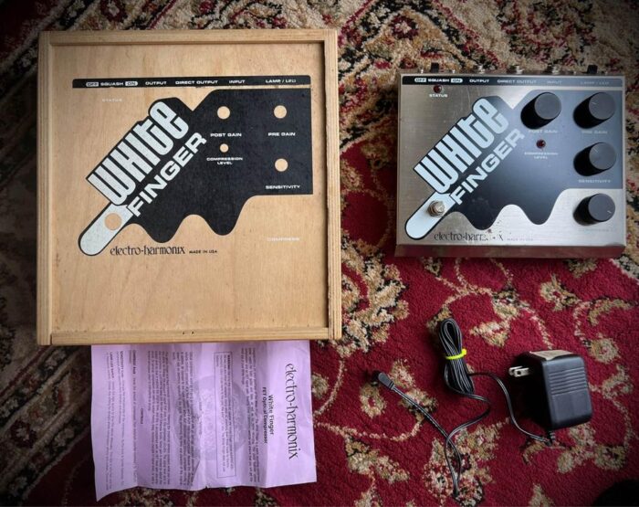 In great condition , all original with manual and wooden box Just like its cousin the Black Finger, the White Finger yields transparent, long sustain that preserves attack. Two optocouplers (LED and lamp) offer distinctly different readings and uniquely varied compressions. The White Finger features multiple FETs instead of vacuum tubes, making it the affordable alternative. Main Features: LED optocoupler for a faster attack compression Lamp optocoupler for softer blooming compressor Quiet long sustains with transparent tones Pre-gain control lets you control how hard your instrument hits the compressor Sensitivity knob for control of how the compression will be hit Compression amount allows you to dial in the perfect ratio for your music Same compression theory as our professional NY-2A but uses FETs instead of tubes 40DC-100 power supply included
