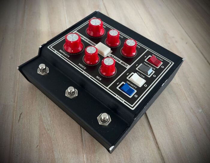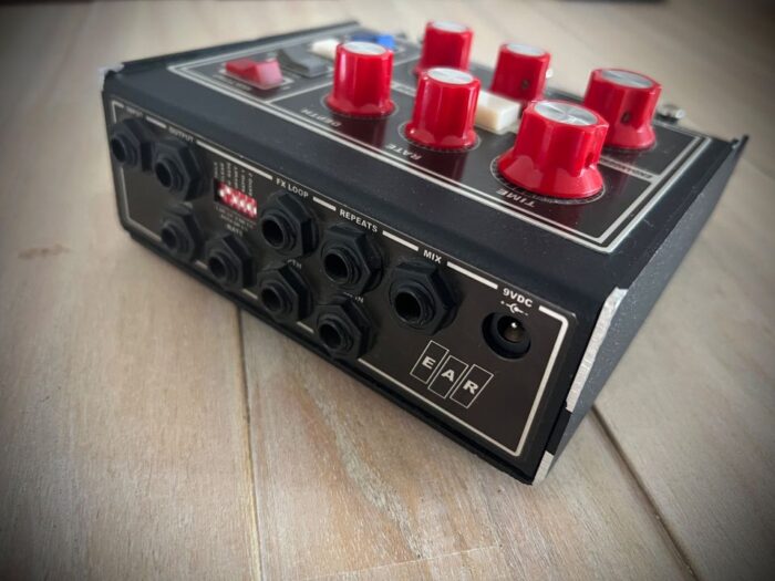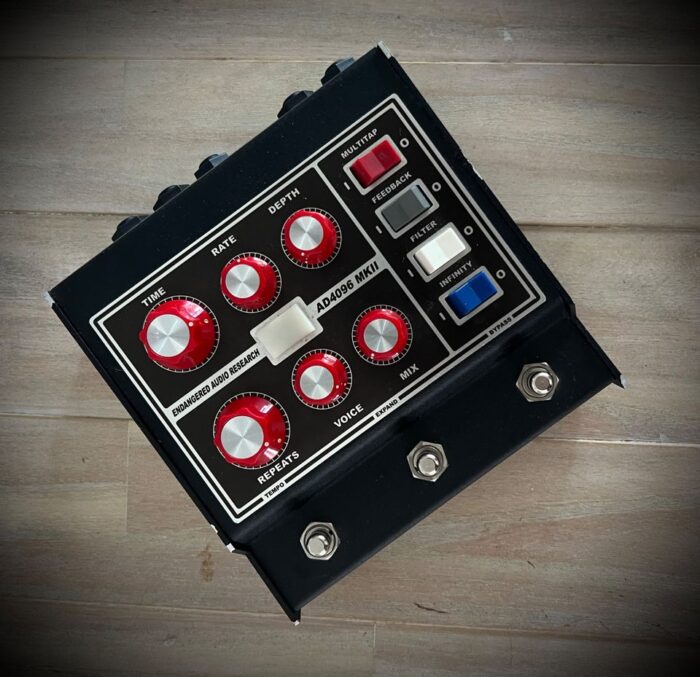 • A super rare version 2 of the already rare EAR Ad4096. Has been a staple on my board for years but I have recently downsized and doesn’t fit any longer. Took me ages to find one and has been the best delay I have ever used. insanely good. It works with both instrument and line level applications, meaning you can use it for guitar, keyboards, and even pro-audio mixing. The new Mix knob allows you to fade between dry and wet signals – perfect for dialing in just the right amount of delay, or capturing the wet only sound for a mix buss. The Loop jack allows you to add effects inside the delay loop. This means if you put a pitch shifter pedal inside the loop, every time the repeat goes around the loop, it will be transposed again and again. You can even add another AD4096 mk2 (or your old AD4096) inside the delay loop for a multi-tap delay sound. The bypass switch is now buffered to allow for delay tails and looping, and to prevent bypass clicking. The way the bypass switch works is programmed by two of the controls on the DIP switch on the back of the pedal. The Infinity Mode you know and love can now be used as to get the “sound on sound” when using the TAILS DIP switch. The Filter switch applies a fixed high pass filter to the incoming signal before it passes to the delay loop to cut out muddy bass frequencies. Use the Clear dip switch to cut even more low frequency. Expression pedal inputs are provided for the Time, Rate, Depth, Mix and Repeats controls, allowing you to bring life to your performance, and do some really interesting things, including real-time analog pitch bending that sounds like tape warble! An upcoming affordable companion pedal will allow you to store and recall tempos for the delay time through the tap tempo input. You’ll also be able to stay lock-step with your DAW at a precise BPM. You can also send click track from your DAW to the Clock input on the delay pedal. To top it all off, this hand-made, through-hole component, all-analog pedal will have beautiful colored rocker switches and will be housed in a box designed by Endangered Audio Research and handmade locally in the mountains of Asheville, North Carolina. Also, the custom-molded unique rectangle light lens will pulse with the tempo of the delay with a specially-selected LED that looks like a soft white incandescent bulb. FEATURES Knobs: Time – Up to 800ms of delay time Mix – Fades between wet and dry signals Repeats – Controls the amount of feedback in the delay line Depth – Controls the amount of modulation in the delay line Rate – Controls the speed or ratio of the modulation Voice – Adds the AD4096 “ECHO” voice as an independent sub mix that allows some incredibly unique mixing options for the voices. Rocker Switches: Feedback – Switches the feedback loop of the delay line out for many unique effects, pitch bends and chorus without delay Filter – Applies a high-pass filter to the signal as it enters the delay loop (not within the delay loop). Dry signal is unaffected by the filter. Infinity – Turns sound-on-sound infinitely sustaining delay mode on or off. Multitap – sends both BBD outputs to the Repeats and Mix similar to a multi head tape delay. Footswitches: Bypass – Buffered bypass switch. The switch is buffered to allow delay tails and to prevent the dreaded true-bypass clicking. The switch is also softer than a true-bypass switch and smooth and easy to switch. Expand – Soft switch that increases Repeats to 100% at a rate determined by the delay time. This level can be controlled by the Mix. Tempo – Tap Tempo footswitch with ratios Jacks: Input – Audio in Output – Audio out Modulation Rate Expression Pedal – Controls the modulation rate or ratio remotely Modulation Depth Expression Pedal – Controls the modulation depth remotely Clock Input – Accepts external clock signals to sync the delay time Time Expression Pedal – control delay time remotely Repeats Expression Pedal – control repeats remotely Loop – Use an insert cable to patch the delay line through other effects Mix Expression Pedal – control the effect mix remotely Power – Requires industry standard Tip Negative 9VDC 115mA. Power supply not included. Note: When using expression pedals, the control knob on the pedal can be used to scale the range of the expression pedal. DIP Switches: Delay Ratio – programs one of four delay ratios Delay Ratio – programs one of four delay ratios Mod Ratio – Switches the Modulation Rate control between varible and ratio mode Offset – this will offset the modulation waveform relative to the delay time Tails – On/Off Clear – Intensifies the low frequency cut when using the Filter Note: – the two delay ratio switches are used in combination to program tempo ratios 1:1 Quarter Note 3:4 Dotted Eighth 1:3 Eighth Note Triplet 2:3 Quarter Note Triplet Light: Rectangular incandescent-looking white light that indicates on/off state as well as blinking the delay tempo Pedal Dimensions L 162mm (6 1/4″) W 154mm (6″) H 73mm (2 7/8″)